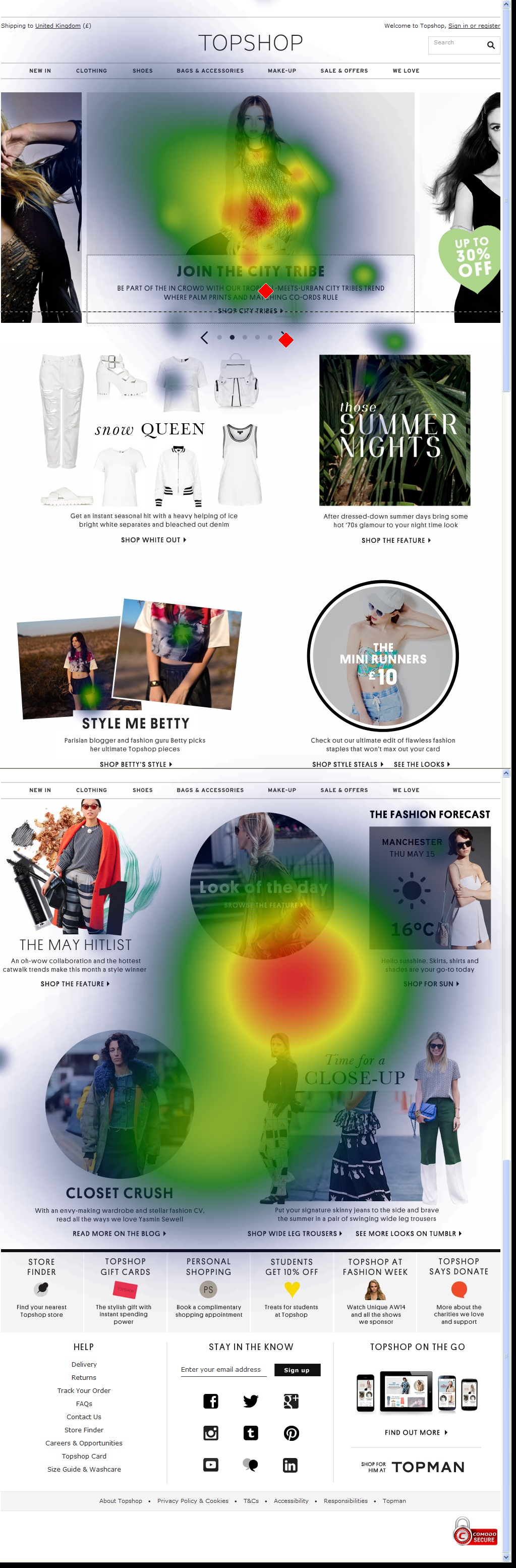 Eye tracking experiments unveiled several usability issues affecting the Topshop website when accessed on a desktop PC. The results of the data analysis from eye-tracking experiments suggest the Topshop website had a fundamental flaw and that there was a need to immediately implement several improvements to the design of the website in order to enhance consumers’ need for a seamless shopping experience and to create an enjoyable interaction.